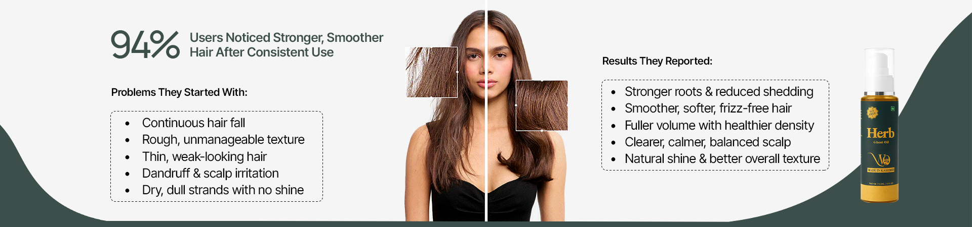 With Herb Ghost Hair Oil, most users feel softer hair within 1–2 weeks. Visible improvements in fall, texture and shine typically appear in 6–12 weeks of consistent use.